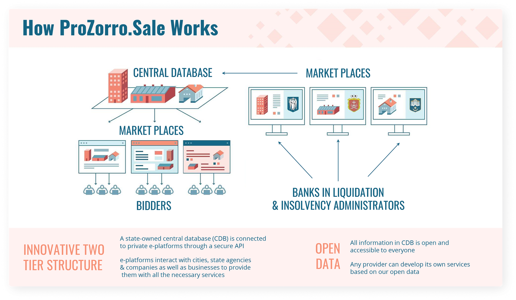 There are three main components of the system: the Central Database (CDB), the Auction Module and E-Trading venues. It’s somewhat similar to the stock exchange and brokers. Venues interact with Central Database, while end users are free to choose any Venue they like. They still will be able to view all tenders available in the entire system. Vendors can bid on any tender, regardless of the venue it is announced through. This approach helps prevent one venue growing into an expensive and inefficient monopoly.